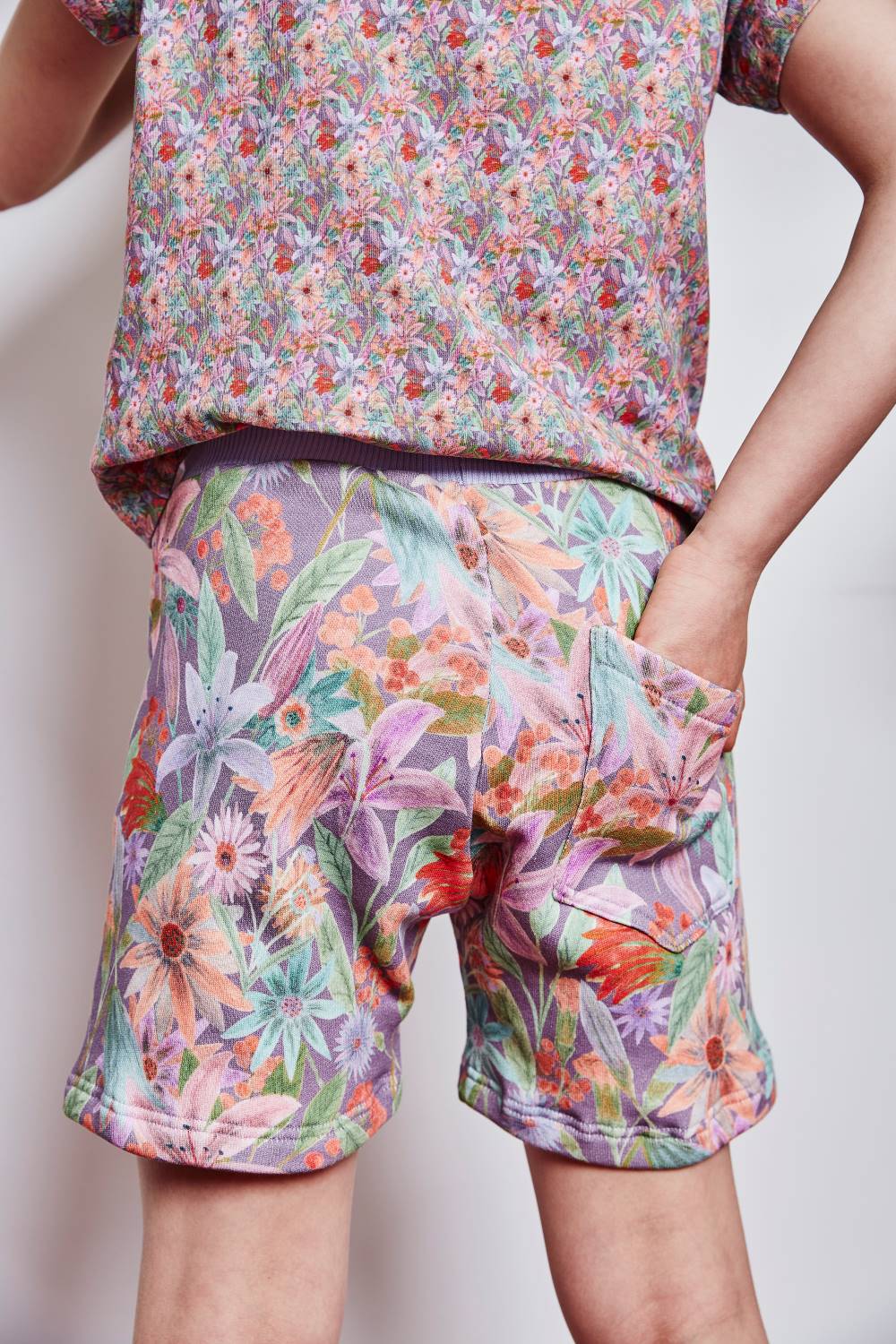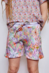 Shorts color: 'Flower Meadow' print in lila. Made from an exclusive hand drawn aesthete aquarella painting.