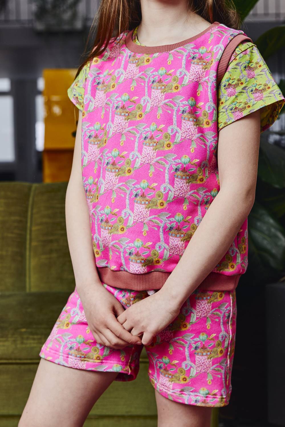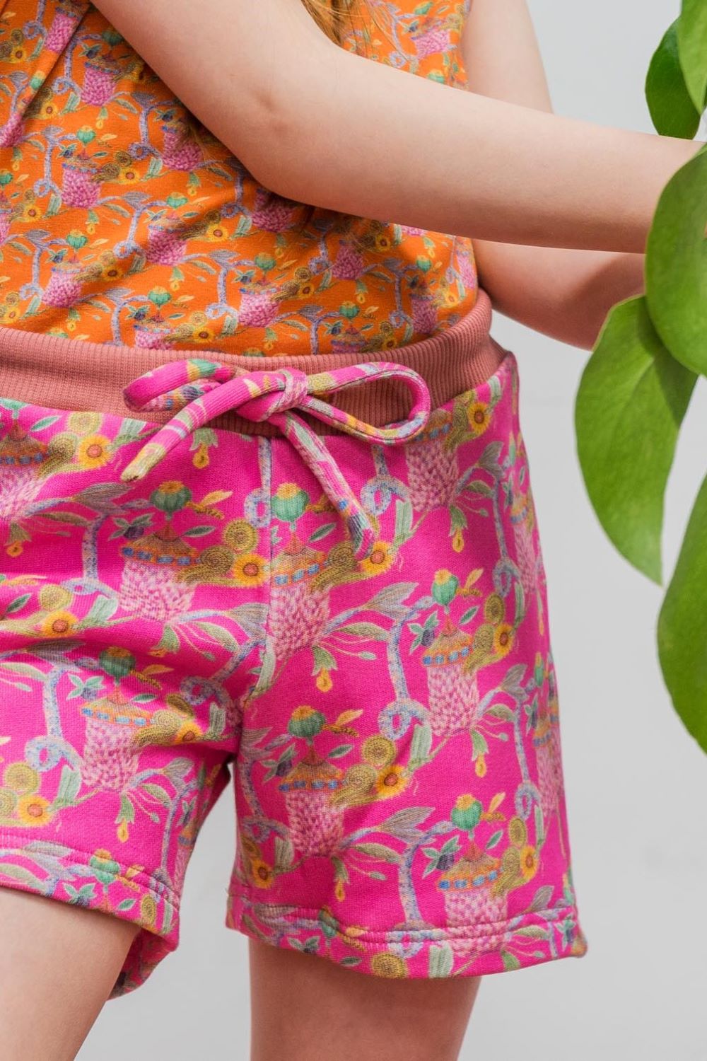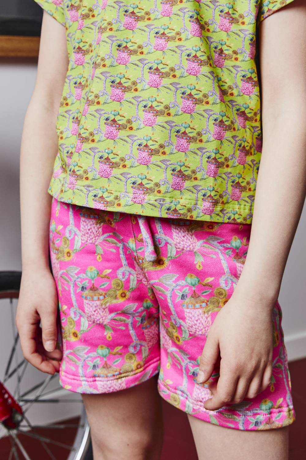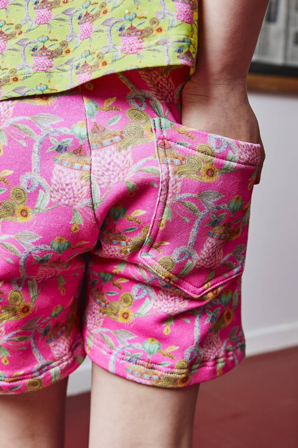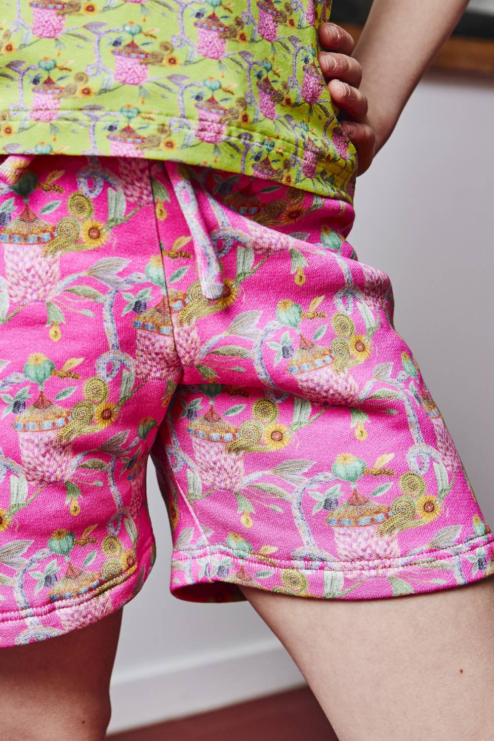 Shorts color: 'Crazy Carousel' print in honest pink. Made from an exclusive hand drawn aesthete aquarella painting.